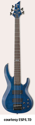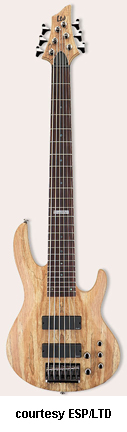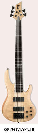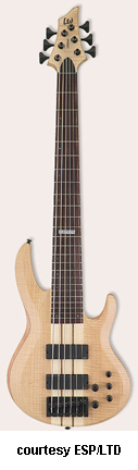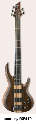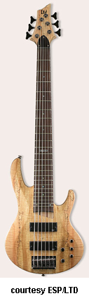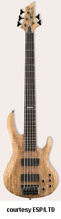 B-404 | - offset double cutaway mahogany body, quilt maple top, five-piece maple/walnut neck, 24-fret rosewood fingerboard with dot and 12th fret model name inlays, two EMG 35-DC/P5 pickups, ESP BB bridge with STB, five knobs, Cosmo black hardware, available in Dark BrownSunburst or See-Thru Black Cherry finish, mfg. 2004-06. |