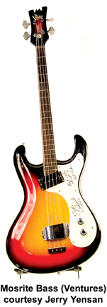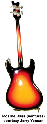 MOSRITE | ELECTRIC BASS: VENTURES SERIES | | VENTURES MODEL BASS (1963-1965) | - bound offset double cutaway hardwood body, set-in maple neck, 20-fret bound fingerboard, adjustable bridge, chrome hardware, 2-per-side tuners, white pickguard, 2 black pickups, volume/tone controls, 3-position switch, side-mounted jack, available in Sunburst or White Pearl finishes, mfg. 1963-65. |