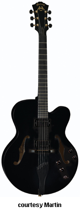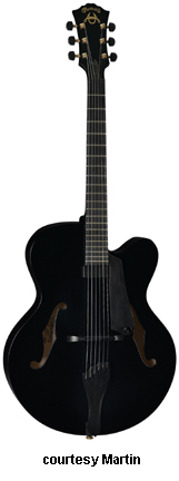 MARTIN | ELECTRIC ARCHTOP: CF SERIES | | CF-1 | - single cutaway archtop body, laminated Alpine spruce top, laminated European flamed maple back and sides, two f-holes, archtop crossbrace bracing, U-shaped flamed maple neck, 14/21-fret ebony fingerboard with no inlays, black micarta headstock overlay with raised gold foil "American Archtop" and "Martin" logos, three-per-side gold Gotoh tuners with ebony buttons, floating ebony bridge, ebony trapeze tailpiece, ebony finger rest pickguard, single Kent Armstrong floating pickup, single black volume knob mounted on the pickguard, available in Black (summer 2005-present), Natural, or Sunburst polished gloss finish, 17 in. body width, 3 in. body depth, 25 in. scale, mfg. 2004-present. |