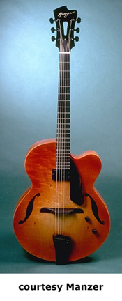 MANZER GUITARS | Instruments currently built in Toronto, Canada since 1974. | Luthier Linda Manzer was first inspired to build stringed instruments after seeing Joni Mitchell perform on a dulcimer in 1969. Manzer began building full time in 1974, and apprenticed under Jean Claude Larrivee until 1978. In 1983, Manzer spent several months with James D'Aquisto while learning the art of archtop guitar building. Manzer gained some industry attention after she completed Pat Metheny's "Pikasso" multi-necked guitar (the model has four necks sharing one common body and 42 strings). In 1990, Manzer was commissioned by the Canadian Museum of Civilization to create a guitar for one of their displays. In addition to building the high quality guitar that she is known for, Manzer included inlay designs in the shape of one of Canada's endangered species on the neck. The extra ornamentation served as a reminder for environmental concerns. Noted players using Manzer guitars include Pat Metheny, Bruce Cockburn, and Carlos Santana. For more information contact Manzer directly (see Trademark Index). | | ELECTRIC ARCHTOP |