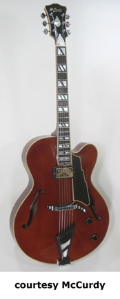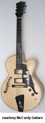 McCURDY GUITARS | Instruments currently built in New York City, NY. | Luthier Ric McCurdy has been producing custom guitars since 1983. Originally based in Santa Barbara, CA, he moved to New York City in 1991 where he studied archtop guitar building with Bob Benedetto. Since then, he has been concentrating on fine archtop and electric guitars for musicians. McCurdy has built and repaired guitars for several artists including John Abercrombie, Sheryl Bailey, Joe Beck, Paul Bollenbeck, Joe Cocker, Kenny Loggins, Jimmy Vivano, Jack Wilkins, and Jimmy Wyble. For further information visit McCurdy's website or contact McCurdy directly (see Trademark Index). | | ELECTRIC |