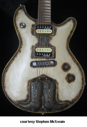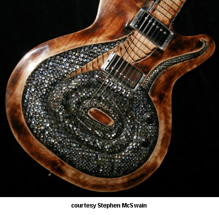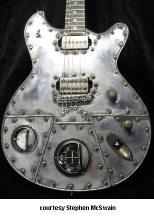 McSWAIN GUITARS | Instruments currently built in Los Angeles, CA. | Luthier Stephen McSwain produces elaborate one-of-a-kind electric guitars and basses in a small shop in Los Angeles. McSwain's high degree of relief, metal work, staining/painting and inlays turn his guitars into playable works of art. Many of the metal top guitars feature various designs including old aircraft gauges that light up once he recesses them into the guitar body. McSwain signs, dates and numbers each guitar, making it a highly collectible guitar or piece of art... depending on how you look at it. Prices start around $5,500 for a basic McSwain model. For more information, price quotations, and availability, contact McSwain directly (see Trademark Index). | |