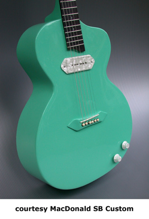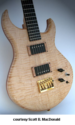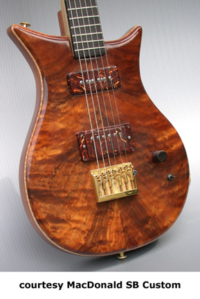 MACDONALD, S.B. CUSTOM INSTRUMENTS | Instruments currently built in Huntington (Long Island), NY, since 1991. | Luthier Scott.B. MacDonald has been building and restoring stringed instruments since 1991. His instruments are built by special order and designed around the needs of each customer. MacDonald offers acoustic, electric, and resophonic instruments. MacDonald is also a warranty/authorized repair center for Gibson, Martin, and Taylor. One of MacDonald's custom instruments is the Resonator Electric, a vintage-style semi-hollow body guitar with a resonator cone. MacDonald also offers a range of acoustic guitars. Refer to the Blue Book of Acoustic Guitars for acoustic information. For more information, a gallery, and sounds on MacDonald guitars visit his website or contact him directly (see Trademark Index). | |