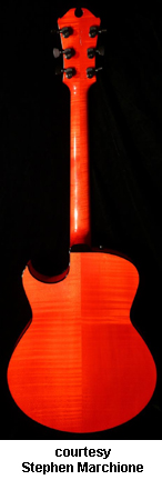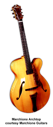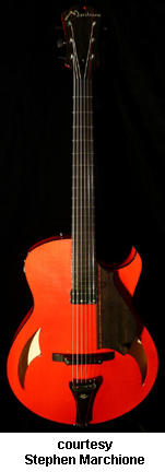 MARCHIONE GUITARS | Instruments currently handcrafted in Houston, TX. Previously produced in New York (Manhattan), NY, since 1993. | Stephen Marchione builds recording quality archtop and special commission guitars. Marchione's clientele primarily consists of New York's top studio and stage players, and he has received commissions from the likes of Mark Whitfield, John Abercrombie, Vernon Reed, and Mark Knopfler. Other notables playing Marchione's guitars are George Wadenius (Steely Dan's Alive in America CD), Mark Stewart (Bang on a Can's Music for Airports CD), and Kenny Brescia and Ira Seigel (sound track for the Broadway smash Rent). Marchione approaches his craft from many different angles. He understands players' sound and comfort needs as a guitar player himself. Marchione also seriously studies the great guitar and violin instruments in order to build archtop guitars that function as pinnacle pieces. When a player brings in a D'Aquisto or D'Angelico to Marchione's Manhattan shop, Marchione scrutinizes the instrument's construction, draws blueprints, and then quizzes the player about the instrument's best qualities. These important elements are then incorporated into his own designs. The violin tradition has also figured prominently in Marchione's building. A hands-on understanding of cello arching is crucial to Marchione's ability to recreate the arching subtleties that imbue his archtop guitars with full acoustic volume and tambour. Marchione's friendship with violin maker Guy Rabut has impressed upon Marchione the importance of incorporating centuries of stringed instrument knowledge. Their friendship has also given Marchione the opportunity to measure and draw plans from Guarnieri cellows as well as Rabut's renowned instruments. Personal musicianship, an exacting approach to guitar making, and the experience of hand building almost three hundred acoustic archtops, neck-throughs, and electric guitars are the groundwork for each and every Marchione guitar. Company information courtesy Stephanie Green. | | ELECTRIC ARCHTOP | ELECTRIC: BOLT-ON NECK MODELS | ELECTRIC: NECK-THROUGH BODY MODELS |