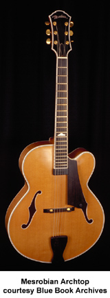 MESROBIAN | Instruments currently built in Salem, MA, since 1995. | Luthier Carl Mesrobian began woodworking at the age of seven, and received his first guitar at the age of fourteen. Like many luthiers, Carl worked on making furniture cabinet after completing the a program in this industry in Boston. After this, he began repairing guitars, and eventually made two of his own. Carl then attended Dick Boak's guitar making class in New Jersey, and has been producing guitars ever since. For further information visit Mesrobian's website or contact him directly (see Trademark Index). | | ELECTRIC ARCHTOP |