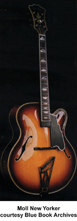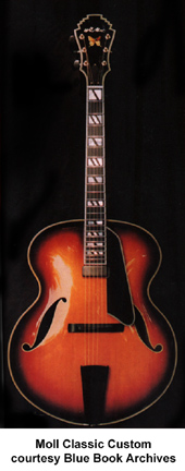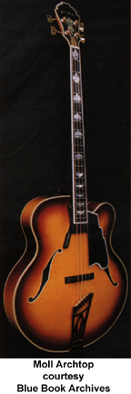 MOLL CUSTOM INSTRUMENTS | Instruments currently built in Springfield, MO, since 1996. | Luthier Bill Moll builds premium custom crafted acoustic flattops and and acoustic and electric archtop guitars. Moll instruments are designed and built to perform acoustically before any electronics are considered. Much of Moll's training comes from his years in the violin business, and several construction aspects of his guitars reflect this. Moll's wife Denise has been studying lutherie since 1997 and continues to help in the shop. For more information, visit Moll's website or contact him directly (see Trademark Index). | | ELECTRIC ARCHTOP/ELECTRIC BASS |