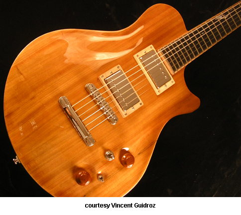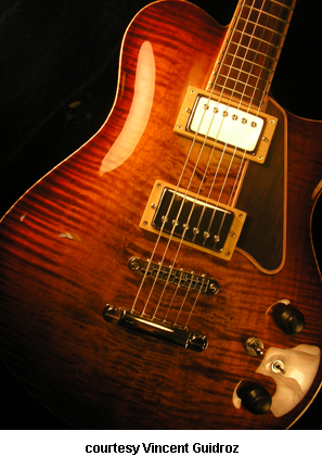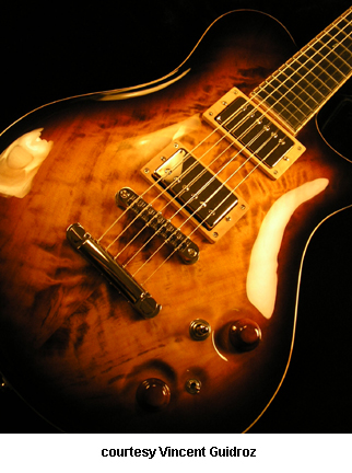 NEW ORLEANS GUITAR COMPANY | Guitars currently produced in New Orleans, LA since 1992. | Luthier Vincent Guidroz builds custom semi-hollowbody and solidbody electric guitars in his New Orleans shop. All guitars are built with a neck-through body design to increase reliabillity. The Voodoo is a solidbody and the JB14 plays like a semi-hollow but still has the NTB design. Figured woods are used for the guitar as well as top end hardware. For more information visit New Orleans' website or contact him directly (see Trademark Index). | |