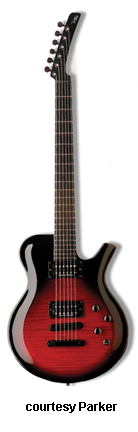 FLY DELUXE SINGLE II (FDV2) | - solid poplar body with basswood neck, custom wound Dimarzio humbucker & 2 single coil pickups plus 6-element Fishman piezo pickups, Custom Fishman Active Filtering Preamp, 5-way pickup selector, exclusive parker neck with carbon & glass fingerboard, stainless steel frets, presicion aluminum bridge with stainless steel saddles, Sperzel locking tuners, 3.5-5 lbs, available in Heather Gray (HG), Dusty Black (DB), or Ruby Red (RR) finishes, mfg. 2000-02. |