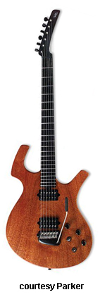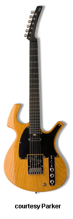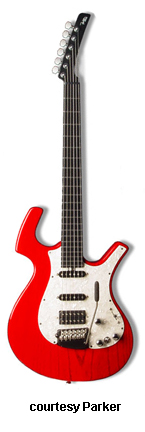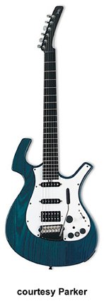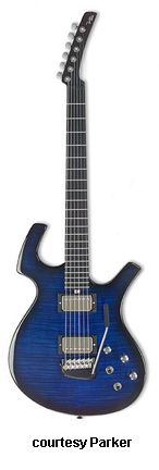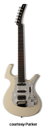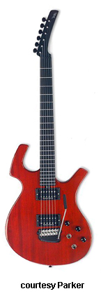 NITEFLY (NFV3) | - offset double cutaway solid maple body, bolt-on basswood (reinforced by a back layer of carbon/glass/epoxy composite), 22-fret composite fingerboard, 6-on-a-side locking Sperzel tuners, black pickguard, Parker vibrato, 3 DiMarzio single coil pickups/Fishman piezo transducer bridge pickup, volume/tone controls, 5-way selector switch (magnetic pickups), piezo volume knob, piezo/magnetic selector switch, available in Black Pearl (B), White Pearl (W), Sunburst (SB), Trans. Red (TR), or Trans. Blue (TB) finishes, mfg. 1998-2000. |