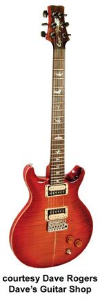 SANTANA MODEL | - this model reproduces Santana's original model with slightly wider lower bout, offset double cutaway mahogany pre-1985 body shape with Paua shell purfling, carved Artist Grade maple top, mahogany neck, 24.5 in. scale, 24-fret (11.5 in. radius) rosewood fingerboard with rippled abalone bird inlays, PRS tremolo system, PRS Eagle inlay on natural wood headstock, abalone OM symbol inlaid on truss rod cover, 3-per-side PRS locking tuners, chrome hardware, 2 Santana Zebra Coil humbucker pickups, volume/tone control, 2 mini switch pickup selectors, available in Santana Yellow finish (with Natural Mahogany back) and various other colors, includes leather case, first 100 signed and numbered, limited mfg. 1995-98 by special order only. |