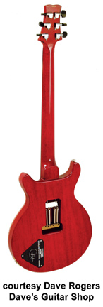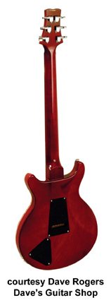 SANTANA II MODEL | - almost identical to the Santana Model, except has artist grade wood, Brazilian rosewood fretboard and headstock veneer, eagle inlayed on headstock, one three-way McCarty style selector switch rather than two mini-toggle switches, master volume control, master tone control, rippled abalone bird inlays, black back plate indicates model with Santana's signature, many finishes available, including Santana Yellow, includes leather case, mfg. 1998-2007. |