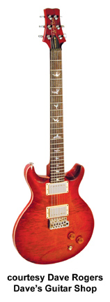 SANTANA III MODEL | - similar to the Santana II model, but less ornate, one-piece South American mahogany body, two-piece curly carved maple top, Santana wide-fat mahogany neck, 24-fret neck East Indian rosewood fingerboard with abalone bird inlays, headstock color matches back/neck, low mass locking tuners, two Santana III pickups with covers, two knobs (v, tone), three-way pickup switch, PRS tremolo 14-1, electronics and tremolo cavity cover, available in various finishes, 24.5 in. scale, mfg. 2001-06. |