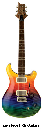 AL DI MEOLA PRISM | - offset double cutaway mahogany body, carved custom curly maple 10 top, set Peruvian mahogany custom profile neck, 22-fret Mexican rosewood fingerboard with bird inlays, Peruvian mahogany headstock overlay with PRS logo, "Al D" truss rod cover, three-per-side tuners, tremolo bridge, two 1957/2008 covered humbucker pickups, two knobs (v, tone), three-way pickup switch, chrome hardware, available in Prism finish, 25 in. scale, hardshell case included, new 2009. |