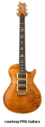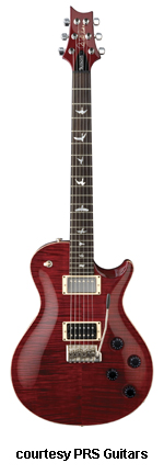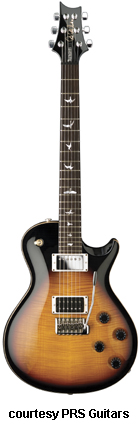 MARK TREMONTI SIGNATURE | - single cutaway design, thick mahogany back with carved maple top, 22-fret mahogany neck, rosewood fingerboard with mother-of-pearl bird inlays, Mark Tremonti 12th fret inlay, headstock color matches back/neck, truss rod cover with mother-of-pearl purfling, PRS adjustable stop tailpiece, PRS locking tuners, two Tremonti pickups, four knobs (two v, two tone), three-way pickup switch, includes case, available in Black, Platinum Metallic or various other finishes, mfg. 2001-04 due to litigation, reintroduced late 2005-present. |