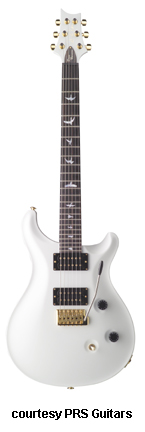 DAVE NAVARRO SIGNATURE | - offset double cutaway carved maple top with mahogany back, set mahogany neck, 24-fret Brazilian rosewood fingerboard with bird MOP inlays, matching headstock with Dave Navarro truss-rod cover and three-per-side tuners, PRS tremolo, one HFS and one Vintage humbucker pickups, two knobs, three-way switch, gold hardware, available in Jet White finish without natural maple edge, mfg. 2005-present. |
