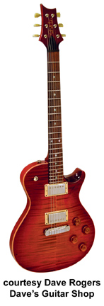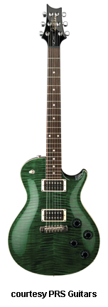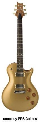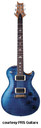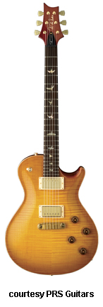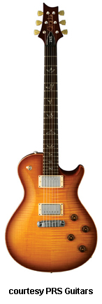 SINGLECUT | - single cutaway body design, thick mahogany back, carved maple top, 22-fret mahogany neck, rosewood fingerboard with abalone dot inlays, wide, fat neck, headstock color matches back/neck, high gloss or satin (new 2006) finish, PRS stop tailpiece, Vintage tuners, two covered PRS #7 pickups, 3-way toggle switch on upper bout, 2 volume/2 tone controls, many colors/finishes, mfg. 2000-disc. 2004 due to litigation, reintroduced late 2005-2007. |