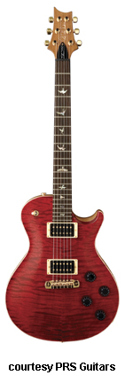 SC 250 | - single cutaway mahogany body, carved firgured maple top, set mahogany neck, 22-fret rosewood fingerboard with pearl dot inlays or optional bird inlays, mahogany headstock overlay with Paul Reed Smith logo, SC250 truss rod cover, three-per-style vintage style tuners, PRS stoptail cobmination bridge/tailpiece, two PRS 250 exposed humbucker pickups (treble and bass), four knobs (two v, two tone), three-way pickup switch on upper bout, chrome hardware, available in various finishes, 25 in. scale, hardshell case included, mfg. 2007-present. |