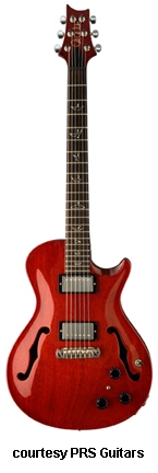 SINGLECUT HOLLOWBODY (STANDARD) | - single cutaway semi-hollow all mahogany body, carved top, two f-holes, set mahogany wide fat neck, 22-fret rosewood fingerboard with moon or optional bird inlays, mahogany headstock overlay with Paul Reed Smith logo, three-per-side PRS low mass locking tuners, PRS stoptail combination bridge/tailpiece, two Archtop covered humbucker pickups (treble and bass), three knobs (two v, tone), three-way pickup switch, mini switch, chrome or optional gold hardware, available in Black, Vintage Cherry, Vintage Mahogany, or Vintage Orange finish, 25 in. scale, hardshell case included, mfg. 2008-present. |