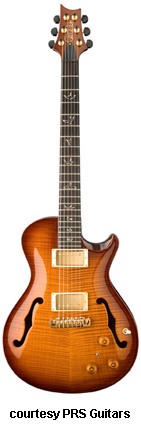 SINGLECUT HOLLOWBODY I | - single cutaway semi-hollow mahogany body, carved figured maple top, two f-holes, set mahogany wide fat neck, 22-fret rosewood fingerboard with moon or optional bird inlays, mahogany headstock overlay with Paul Reed Smith logo, three-per-side PRS low mass locking tuners, PRS stoptail combination bridge/tailpiece, two Archtop covered humbucker pickups (treble and bass), three knobs (two v, tone), three-way pickup switch, mini switch, chrome or optional gold hardware, available in various finishes, 25 in. scale, hardshell case included, mfg. 2008-present. |