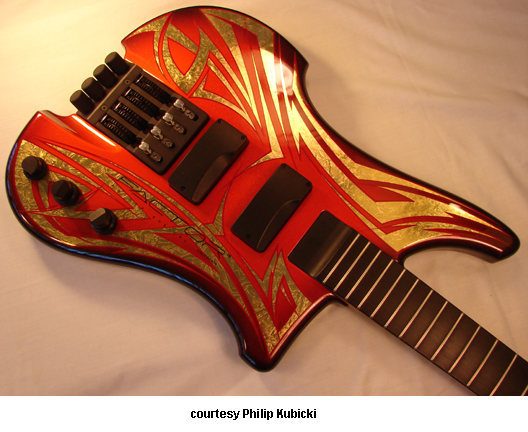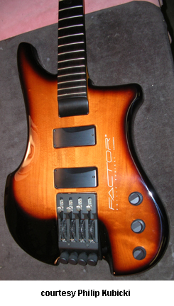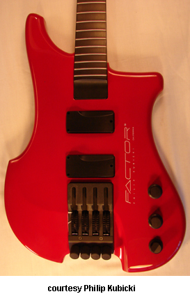 PHILIP KUBICKI TECHNOLOGY | ELECTRIC BASS | All instruments are available in Bahama Green, Black, Charcoal Pearl, Midnight Blue Pearl, Red, Tobacco Sunburst, Transparent Blue Burst, Transparent Burgundy, Red, White and Yellow finishes. Kubicki also makes custom basses that feature exotic woods and the like. For more information on these refer to the website to see what is in stock. | EX FACTOR 4 | - offset double cutaway wave style maple body with screened logo, laminated maple neck, 32 in. to 36 in. scale, 24-fret ebony fingerboard, fixed aluminum bridge with fine tuners (reverse tuning design), four string anchors on peghead with low E string clasp (D Tuner), black hardware, two Kubicki humbucker pickups, stacked volume/mix control, stacked treble/bass control, five-position rotary switch, active electronics, mfg. 1985-present. |