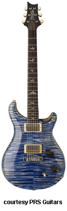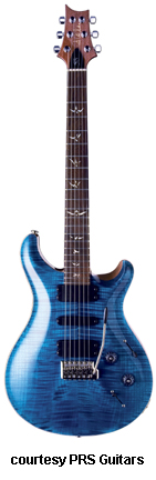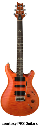 513 ROSEWOOD | - offset double cutaway with carved 10-top maple front, mahogany body with Brazilian rosewood neck and fretboard, 22-fret fingerboard with new 513 style bird inlays, thin profile body, five proprietary PRS single coil pickups allowing thirteen modern and vintage sounds, compensated scalloped nut, redesigned neck joint, volume and tone controls with two blade switches, PRS tremelo bridge, 25.25 in. scale, mfg. 2004-06. |