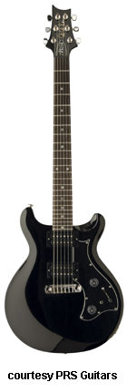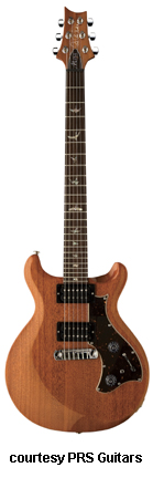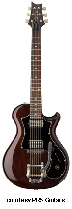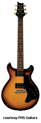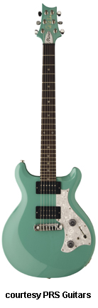 MIRA | - slightly offset double cutaway mahogany body with contoured edges, set mahogany neck, 24-fret rosewood fingerboard with pearl dot or optional bird inlays, matching finish headstock overlay with PRS logo, "Mira" inscribed on truss rod cover, three-per-side PRS low mass locking tuners, PRS combination bridge/stop tailpiece, small white pearl or tortoise pickguard, two Mira exposed humbucker pickups (treble and bass), two knobs (v, tone), three-way pickup switch, mini coil tap switch, chrome hardware, available in Black, Lilac (2008 only), Powder Blue, Sand Storm, Seafoam Green, Vintage Cherry, Vintage Mahogany, Vintage Orange, or Wild Mint finish, 25 in. scale, hardshell case included, mfg. 2008-present. |