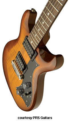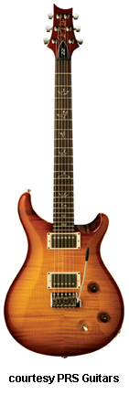 SUNBURST 22 | - offset double cutaway mahogany body, carved figured maple top, set mahogany wide/fat neck, 22-fret rosewood fingerboard with bird inlays, mahogany headstock overlay with PRS logo, "22" on truss rod cover, three-per-side Phase II low mass locking tuners, tremolo bridge, two 1957/2008 covered humbucker pickups, two knobs (v, tone), three-way pickup switch, nickel hardware, available in Sunburst finish, 25 in. scale, hardshell case included, new 2009. |