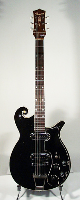 - double cutaway with scroll bass bout, bolt-on neck, rosewood fingerboard with dot inlay, 3-per-side or 6-on-a-side (older) tuners, long pickguard, single pickup, various knobs, nickle hardware, available in Ruby (E-721), Natural (E-725), Ebony (E-729), or Sunburst (E-733) finishes, mfg. 1958-1970. |