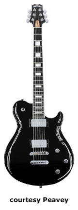 PEAVEY | ELECTRIC: JACK DANIEL'S SERIES | | JACK DANIEL'S EX | - single cutaway mahogany body, arched and contoured top, mahogany set-neck, 22-fret rosewood fingerboard with block inlay, Jack Daniel's on headstock with three-per-side tuners, standard stop tailpiece, two high output Peavey humbucker pickups, three knobs with Old No. 7, three-way switch, chrome hardware, available in Black finish with Jack Daniel's graphic, mfg. 2005-present. |