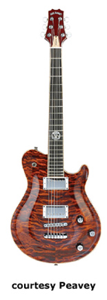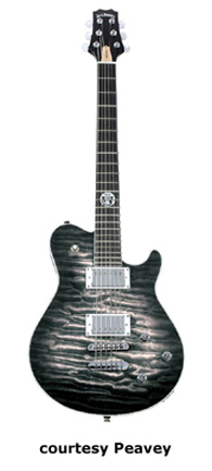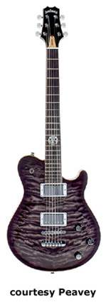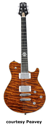JACK DANIEL'S USA | - single cutaway mahogany body, AAAAA arched quilted maple top, contoured back, mahogany set-neck, 22-fret ebony fingerboard with 11-13th fret Old No. 7 inlay, custom control, switch, and truss-rod covers made of aged Jack Daniel's wooden whiskey barrels, Jack Daniel's on headstock with three-per-side tuners, Dual-Compression tailpiece, STB, two high output Peavey humbucker pickups, three knobs with Old No. 7, three-way switch, chrome hardware, available in Trans. Charcoal, Trans. Whiskey, or custom color finishes, 24.75 in. scale, mfg. 2005-present. |