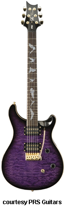SE PAUL ALLENDER | - offset double cutaway mahogany body, carved maple top with a quilt maple veneer, natural maple body edging, maple wide thin neck, 24-fret rosewood fretboard with special bats in flight inlays, black headstock overlay with "SE Paul Allender Model" logo, PRS truss rod cover, three-per-side tuners, PRS designed tremolo bridge, two Paul Allender exposed humbucker pickups (Treble and Bass), two knobs (v, tone), three-way pickup switch, gold hardware, available in Custom Paul Allender purple burst finish, 25 in. scale, Cordura gig bag included, mfg. mid-2007-present. |