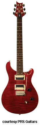 SE SANTANA | - entry level Santana model, mahogany body and mahogany 22-fret set neck, rosewood fingerboard with SE shell (disc. mid-2002) or white pearloid (new mid-2002) inlays, gloss black headstock with Santana SE logo, unbound (disc.) or bound fingerboard and headstock (new mid-2002), PRS designed tremolo or stop tailpiece, PRS designed non-locking tuners, two covered humbucker (disc.-2002) or two uncovered open coil pickups (new mid-2002), 1 volume/1 tone control, three-way selector switch, with (new mid-2002) or w/o (disc. mid-2002) small contoured 3-layer pickguard, current production has contoured lower about for player comfort, available in Royal Blue (disc. 2003), Tobacco Sunburst (2002-06), Pearl White (mfg. 2002-03), Silver (mfg. 2002-03), Grey Black (disc.), Teal (disc.), Aqua Metallic (mfg. 2002-03), Black (2004-06), or Vintage Cherry finishes, includes Cordura gig bag, mfg. in Korea, mfg. 2001-06. |