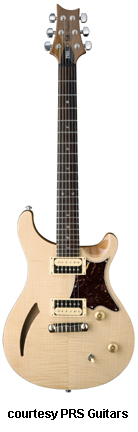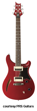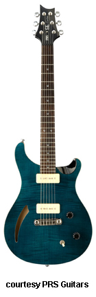 SE CUSTOM SEMI-HOLLOW BODY | - offset double cutaway semi-hollow mahogany body, carved maple top with optional flame maple veneer single cat's-eye sound hole, set mahogany wide fat neck 22-fret rosewood fretboard with moon inlays, "SE Custom" logo on headstock, three-per-side PRS-designed tuners, PRS-designed combination bridge/stop tailpiece, optional pickguard, available with two Zebra humbucking pickups (Treble and Bass) or two Soapbar pickups (2008-present), two knobs (v, tone), three-way pickup switch, chrome hardware, available in Black, Blue Matteo with Black back (2008 only), Metallic Red (2007 only), Natural, or Tobacco Sunburst (new 2009) finish, 25 in. scale, Cordura gig bag included, mfg. 2007-present. |