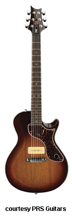 SE ONE | - single cutaway mahogany body, mahogany wide fat neck, 22-fret rosewood fingerboard with moon inlays, corresponding finish headstock overlay with "SE One" logo, three-per-side tuners, PRS-designed combination bridge/stop tailpiece, tortoiseshell pickguard, single soapbar pickup, single volume control, available in Antique White (new 2009), Black (2008 only), Tobacco Sunburst, or Vintage Cherry (2007-08) finish, 25 in. scale, Cordura gig bag included, mfg. 2007-present. |