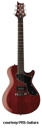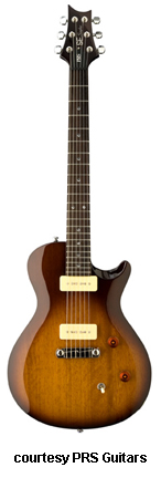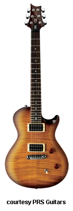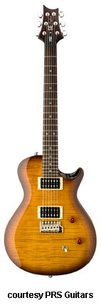 SE SINGLECUT | - single cutaway mahogany body with a maple top or a flame maple top, natural maple edging, set mahogany neck, 22-fret rosewood fingerboard with moon inlays, black headstock overlay with "SE Singlecut" logo, PRS truss rod cover, PRS designed stoptail combination bridge/tailpiece, two PRS design humbucker pickups, two knobs (v, tone), three-way pickup switch, available in Antique White (new 2009), Black, Black Cherry (2006-07), Cherry Sunburst (new 2009), Blue Matteo (2008 only), Gray Black (2008-present), Tobacco Sunburst, or Whale Blue (2007 only) finish, 25 in. scale, Cordura gig bag included, mfg. 2006-present. |