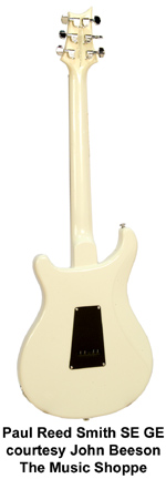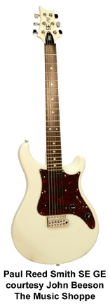 SE EG | - mahogany body with arm carve and pickguard, mahogany neck with 22-fret rosewood fingerboard, 25 in. scale, mooninlays, wide fat neck carve, PRS tremelo or stop tailpiece, PRS non-locking tuners, S/S/S or S/S/H pickup configuration, five-way blade pickup selector, volume and tone controls, available in Metallic Red with white pickguard (disc.), Metallic Blue with white pickguard (disc.), Antique White with tortoiseshell (disc.) or black (new 2006) pickguard, Black with black pickguard (new 2006), or Black Sunburst with black pickguard (new 2006), mfg. 2004-2006. |