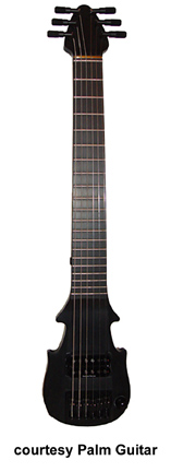 PALM GUITAR | Instruments currently built in Southbury, CT. | The Palm Guitar is advertised as the World's smallest electric guitar. This guitar is truly portable as it is only 26 in. long and weighs in at three pounds. The body is made out of a carbon fiber graphite composite so it won't warp in excessive heat or cold. For more information contact Palm directly, or refer to their website (see Trademark Index). | | ELECTRIC |