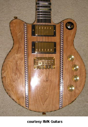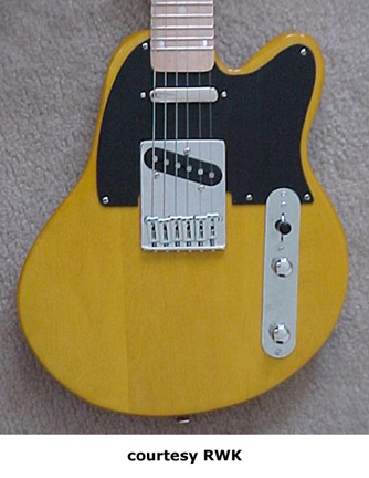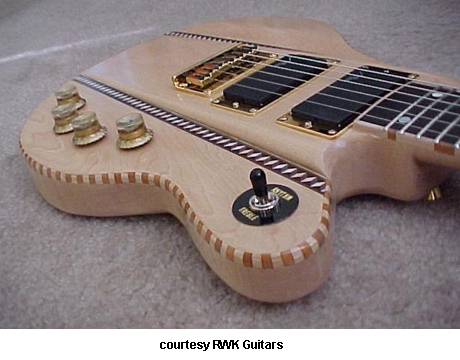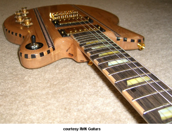 RWK GUITARS | ELECTRIC | RWK also produced the Phoenix model that is a scaled-down Firebird model. | S.E.T. (SOLID ELECTRIC THROUGH-NECK) | - single cut-away, ergonomically shaped maple body, solid maple through-neck design, wood top binding, 24-fret bound ebony fingerboard with dot inlay, string through-body bridge, three-per side Schaller tuners, gold plated hardware, two humbucker pickups, four knobs (two v, two tone), three-way switch, Translucent natural finish, hardware substitutions are encouraged, current mfg. |