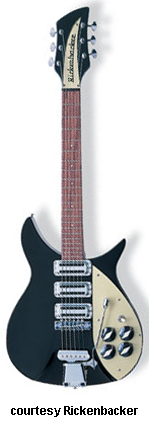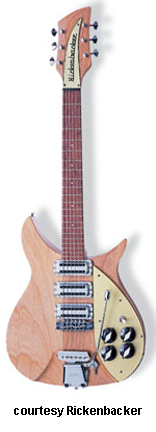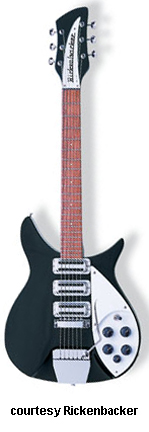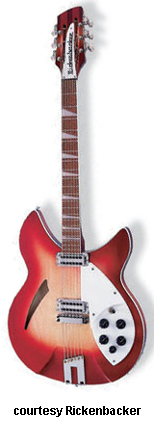 360/12C64 12-STRING | - 12-string configuration, semi-hollow maple body, double bound body, maple neck, 21-fret rosewood fingerboard with trapeze inlays, matching headstock with six-per-side tuners, six-way split saddle bridge, trapeze tailpiece, two Vintage Single Coil Toaster Top pickups, white pickguard, five knobs (two v, two tone, mix), three-way switch, available in Fireglo finish, Vintage reissue case included, 24.75 in. scale, mfg. 2001-present. |