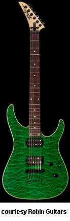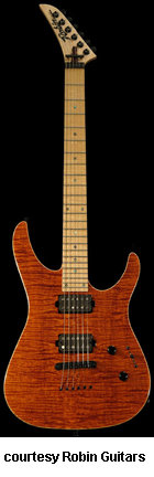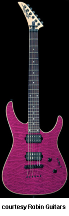 MEDLEY VI EXOTIC TOP | - offset double cutaway Strat-style hardwood body, bound figured maple top, bolt-on maple neck, 24-fret rosewood fingerboard with pearl dot inlay, reverse hockey stick-style headstock with six-on-a-side Sperzel tuners, double locking Floyd Rose vibrato, one single coil rail and one exposed pole piece Seymour Duncan humbucker pickups, two knobs (v, tone), five-way pickup switch, black hardware, available in various finishes, mfg. 1991-95. |