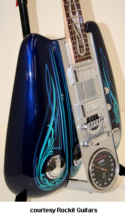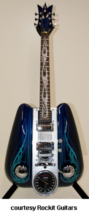 ROCKIT GUITARS | Guitars currently produced in Everett, WA since 2006. Distributed by Rockit Guitars. | Innovator and designer Rod "Hot Rod" MacKenzie, best known for creating custom cars, motorcycles, boats and airplanes, developed the Rockit Guitar for fun after getting the idea from his motorcycle's gasoline tank. MacKenzie took an actual steel motorcycle gas tank, reshaped it and with his friend, luthier Bill Rehberg, attached some used electric guitar parts to it. The Rockit Guitar was born as a symbol of the unity between music and motorcycles. After a year of obsessive tinkering, Rod perfected his tuned harmonic cage design that harnesses string vibrations and transfers it through to a tuning rod. The harmonic cage fastened under the dash is then bolted to the truss rod that runs up the neck and is fastened to the brass nut. Combined with the light weight composite body, the guitar produces incredible tones and unparalleled sustain and harmonic control. The weight was also reduced from its original 28 lbs. to just over 9 lbs. The prototype models were completed in the fall of 2006, and the first production model was delivered to Toby Keith and publicly released in his March 2007 hit video "High Maintenance Woman." Besides the unique gas tank-shaped body, other features of the guitar include a custom maple neck featuring a signature flamed dimensional headstock and flamed fretboard inlay, two Seymour Duncan Pearly Gates pickups wired single/double coil offering six positions, and a speedometer that is actually a digital full chromatic tuner. Each guitar is hand-built by MacKenzie and his staff, and they only plan on building 650 total instruments. There will be 500 Standard Model (MSR $4,995) guitars built and 150 Special Edition (MSR $6,995) guitars built. Mike Soldano created a special matching 110 watt tube 2-12 in. speaker combo amp called the Soldano Rockit V-Twin (MSR $3,495) which is exclusively available through Rockit Guitars. For more information, visit Rockit Guitars' website or contact them directly (see Trademark Index). | |