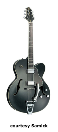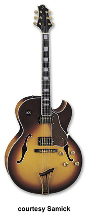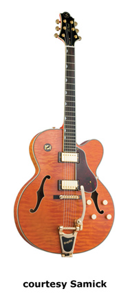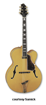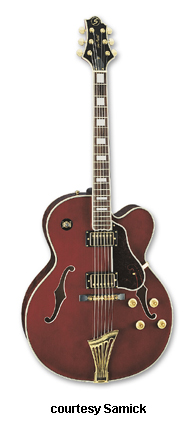 JZ 2 | - single cutaway hollowbody, select spruce top, quilt maple sides and back, 22-fret rosewood fingerboard with block inlay, two Duncan design humbucker pickups, jazz style bridge, three-per-side Grover tuners, four knobs (two v, two tone), available in Antique Natural, Vintage Sunburst, or Wine Red finish, case included, current mfg. |