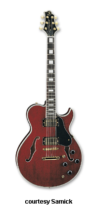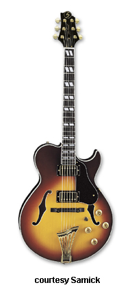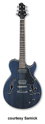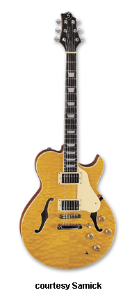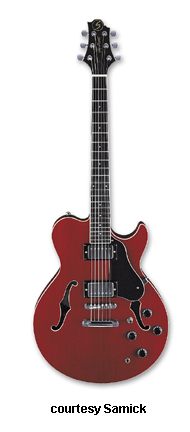 RL 3 | - single cutaway hollowbody, quilted maple arched top, striped mahogany back and sides, set neck, 22-fret rosewood fingerboard with trapezoid inlay, two Duncan Designed humbucker pickups, three-per-side Grover tuners, black pickguard, four knobs (two v, two tone), three-way switch, available in Amber, Original Sunburst, Trans. Red, or Vintage Sunburst finish, mfg. 2001-present. |