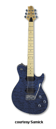 SAMICK | ELECTRIC: FASTBACK SERIES | | FB 1 | - offset single cutaway sixties style bound agathis body, high tech Quilt top, bolt-on neck, 22-fret rosewood fingerboard with dot inlays, three-per-side Grover tuners, standard tremolo, two Duncan Designed direct mount humbucker pickups, three knobs (two v, tone), three-way switch, chrome hardware, available in Trans. Red, Trans. Blue, or Trans. Black finish, current mfg. |