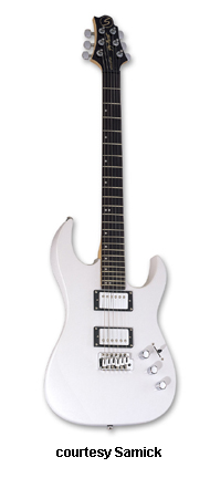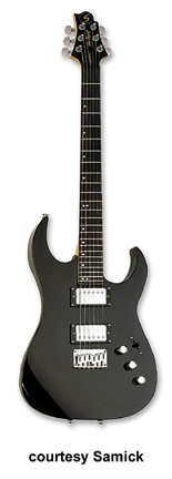 SAMICK | ELECTRIC: INTERCEPTOR SERIES | The Interceptor Series includes models IC 1, IC 2, IC 3, and IC 4. This series was discontinued in 2003 and replaced by the Incerceptor II series, which are models IC 10, IC 20, and IC 30. | IC 1 | - offset double cutaway agathis body, bolt-on neck, 24-fret rosewood fingerboard, one humbucker and two single coil pickups, 3-per-side chrome tuners, three knobs (v, 2 tone), 5-way switch, available in Black or Wine Red finishes, disc. 2003. |