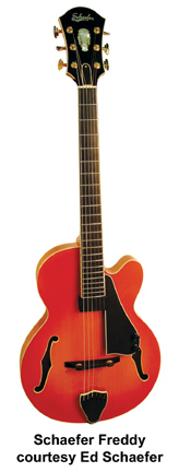 SCHAEFER 15 | - archtop body, select Sitka spruce or European spruce top, European maple back and sides, two f-holes, three-piece hard rock maple neck, ebony fingerboard, three-per-side tuners, ebony bridge, ebony tailpiece, single-ply binding on the body, neck, headstock, f-holes, pickguard, tailpiece, and truss rod cover, high-gloss nitrocellulose lacquer finish, hardshell case included, 15 in. lower bout, 2.375 in. sides, current mfg. |
