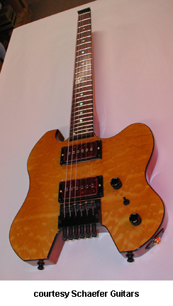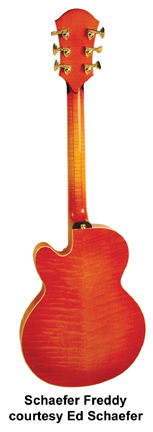 SCHAEFER GUITARS | ELECTRIC | Schaefer's archtop models feature AAA Sitka or European spruce tops, European Maple backs and sides, and three-piece maple necks. Schaefer is currently constructing his archtop guitars on a custom order, commission basis. All Schaefer guitars come with a choice of Kent Armstrong or Bartolini pickups. | CASANOVA | - thinline double cutaway body, quilted or flamed maple top, sides, and back, three-piece maple neck, split-block MOP inlay on fingerboard, gold Grover Deluxe tuners, Art Deco headstock inlay, bound entire guitar, f-holes, pickguard and tailpiece, 2 Kent Armstrong gold covered humbucker pickups, available in high gloss nitrocellulose lacquer finish, tweed hardshell case included, current mfg. |
