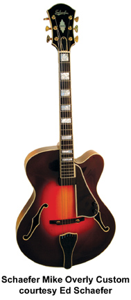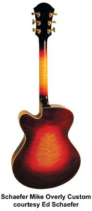 MIKE OVERLY CUSTOM | - 16 in.archtop body, Venetian cutaway, Flamed Maple back and sides, Sitka spruce or European spruce top, three-piece Flamed Maple neck, three-ply bound headstock, three-ply bound Ebony fingerboard, three-ply bound top and back, three-ply bound f-holes, three-ply bound Ebony pickguard, custom bound tailpiece, custom bound truss-rod cover, gold Schaller tuners, adjustable Ebony bridge, 25 in.fret scale, double action truss rod, double carbon-fiber reinforced neck, headstock inlay, available in nitrocellulose lacquer finish, hardshell case included, current mfg. |