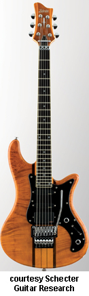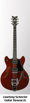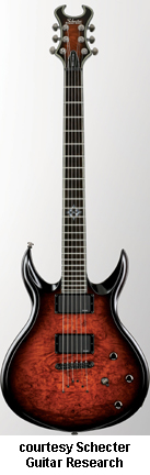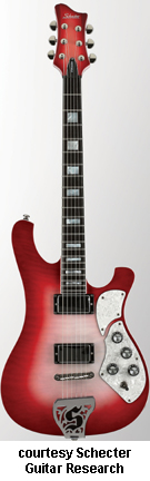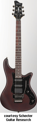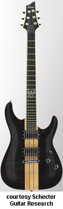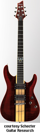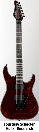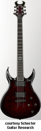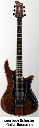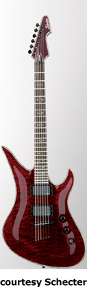 HOLLYWOOD CLASSIC | - offset double cutaway Strat-style mahogany body, flame maple contoured wings, multi-ply maple/wenge/walnut NTB, cream body binding, 24-fret cream bound ebony fingerboard with 12th fret MOP Schecter Crest inlay, cream bound headstock with matching finish overlay, TonePros tune-o-matic bridge, STB, two Seymour Duncan covered humbucker pickups (SH-11/SH-1n), two knobs (v, tone with a coil tap), three-way pickup switch, chrome hardware, available in See-Thru Black or See-Thru Red finish, 25.5 in. scale, new 2008. |