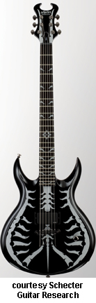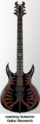Scorpion Hellraiser | - similar to the Scorpion, except has an ultra-excess setthree-piece mahogany neck, 24-fret rosewood fingerboard with abalone gothic cross inlays, black pearl binding, black hardware, and two EMG humbucker pickups, mfg. 2005 only. |